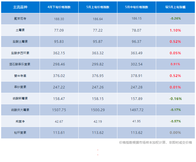 泰乐菌素、替米考星、泰万菌素--主流工厂停报挺价策略持续,市场库存有限,价格高位,贸易市场询采放缓(市场酒泰305元/kg附近、磷替350元/kg附近、替米考星380元/kg附近、泰万菌素435元/kg附近、泰妙菌素245元/kg附近),市场关注度较高,本期市场价格指数维稳。