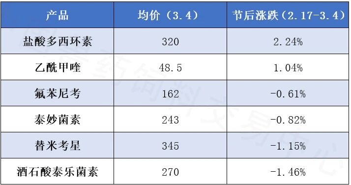 从具体品种来看,受益于节后中下游集中补库及供应收紧,盐酸多西环素以2.24%领涨,4日市场均价为320元/千克。其后是乙酰甲喹,受上游关键中间体成本抬升推动,节后上涨1.04%,市场均价为48.5元/千克。替米考星、泰妙菌素以及酒石酸泰乐菌素等则延续去年四季度态势,均价继续回落。氟苯尼考底部震荡持续,行业整体处于微利或亏损状态,厂家复产积极性不高。