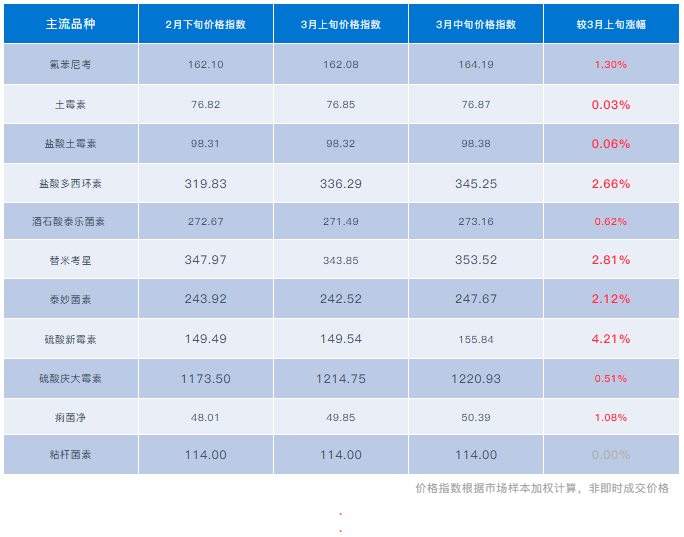 3、兽药原料:兽药原料药市场走强态势明显,上游供应收紧,市场惜售情绪发酵,看多后市,询采积极。盐酸多西环素、乙酰甲喹受现货紧缺影响,价格坚挺上行;硫酸新霉素、泰妙菌素、酒石酸泰乐菌素、替米考星跌势企稳,价格止跌回弹;氟苯尼考亦现底部反弹迹象,市场看多氛围渐浓。后市,继续密切监测中东局势以及厂家发货节奏,一旦地缘风险缓和市场可能出现“急刹车”,需预留灵活应对空间。