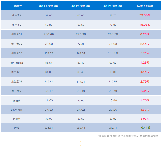 维生素市场整体走势偏强,部分品类价格大幅跳高。市场停报、停签现象普遍,供应收紧叠加惜售情绪蔓延,产品报价混乱中持续走高,一日数调已成常态。中下游采购积极性明显升温,市场观望情绪减弱。VA(涨29%)、VE(涨18%)因货源极度紧缺,主流厂家强势挺价,成交价格大幅上行;泛酸钙、烟酰胺、VK3、VD3、VB12、VC等亦受上游供应收缩支撑,成交重心明显上移;仅叶酸等少数品类维持弱稳运行。后市需密切关注主流厂家控货策略及地缘冲突对关键原料进口与生产成本的进一步扰动。