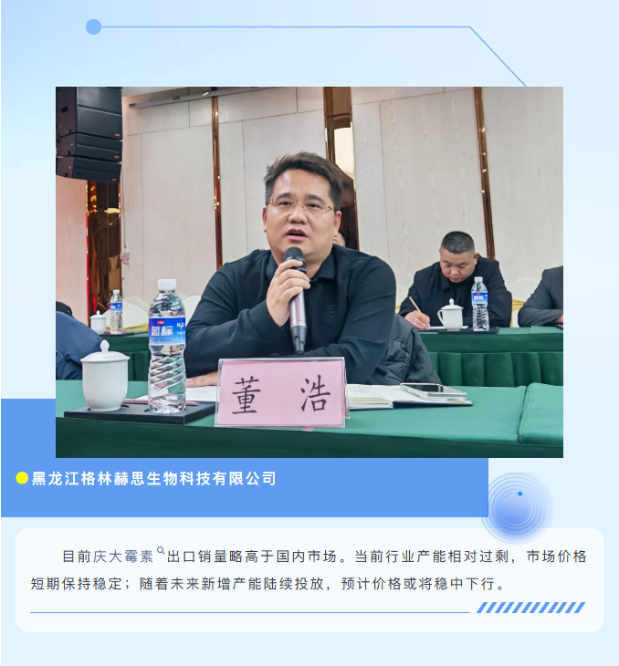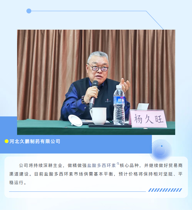 会议围绕盐酸多西环素、酒石酸泰乐菌素、硫酸链霉素、乙酰甲喹、地美硝唑、阿莫西林、硫酸庆大霉素、盐酸大观霉素等主流原料药品种,深入交流了市场供需、价格走势、成本变化及国际局势影响。与会者对各品牌企业的战略布局、核心产品的技术优势、价格运行逻辑及未来市场格局有了更为全面和深入的认识,为后续的市场研判与经营决策提供了有力支撑。