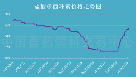 31日,盐酸多西环素市场均价为355元/千克,3月以来每吨涨42000元。目前厂家发货偏紧,但随着新货源涌入,市场供应状况会改善,短期看,产品价格维持偏强震荡,上行动能趋缓。