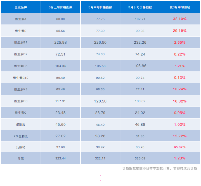 维生素市场延续强势上行格局,主流厂家维持停报、停签策略,市场惜售情绪浓厚,流通货源持续收紧,推涨动能仍存。泛酸钙(涨65.82%)、VA(涨32.10%)、VE(涨29.19%)等再次出现大幅跳涨;生物素、VD3、VK3亦同步走强,价格快速上移;VB2、VB12烟酰胺等供需相对均衡,价格维稳运行。需注意,尽管市场整体表现抢眼,但下游追涨热情已有所降温,观望与谨慎情绪逐步抬头,追涨风险加大,避免高价囤货,警惕踩踏式暴跌。