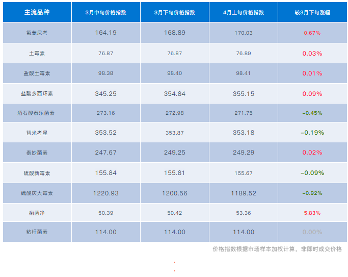 3、兽药原料:兽药原料药市场回归供需基本面,整体走势趋于平稳,主流品类逐步分化,市场观望情绪继续回升。乙酰甲喹受成本支撑及厂家挺价策略推动,市场均价持续上行,年内每吨涨近万元;盐酸多西环素等3月以来持续强势的品类,本期涨势暂歇;酒石酸泰乐菌素、替米考星、硫酸新霉素等产品需求疲软,价格出现小幅回落。预计后市将以结构性行情为主,整体维持震荡格局。建议对强势品类不宜盲目追涨,对价格回落或需求偏弱的品类,宜采取随用随采策略。