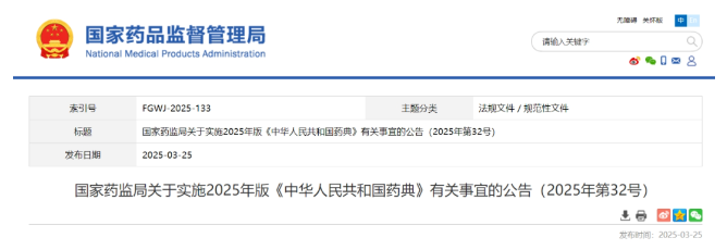 3月25日,国家药监局网站发布《国家药监局关于实施2025年版〈中华人民共和国药典〉有关事宜的公告》。全文如下: