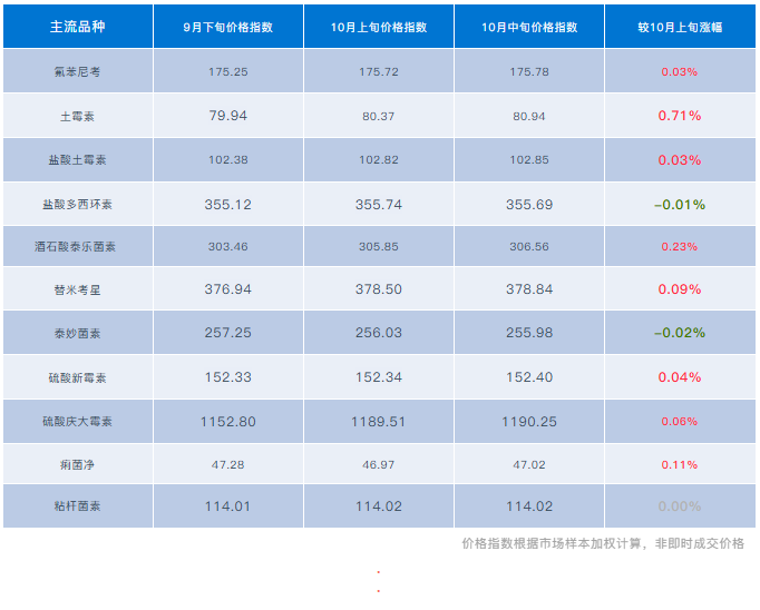 泰乐菌素、替米考星、泰万菌素--厂家报价坚挺,养殖大厂大单锁定,供应紧张,交投活跃,市场关注度高(市场酒泰305元/kg附近、磷替340元/kg附近、替米考星380元/kg附近、泰万菌素425元/kg附近、泰妙菌素250元/kg附近),本期市场价格指数偏强运行。