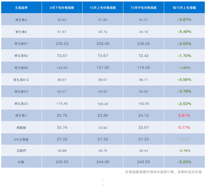 烟酰胺:上游挺价,部分厂家停报,实际效果一般, (市场报价33-38元/kg),本期市场价格指数维稳震荡。