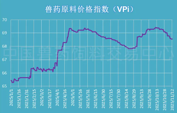 中国兽药饲料交易中心监测数据显示,11月12日,兽药原料价格指数(VPi)收于68.55,环比下跌0.32%,兽药原料药市场弱势态势不变。
