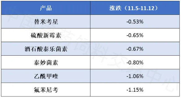 具体来看,本周氟苯尼考跌幅居前,环比下跌1.15%;乙酰甲喹紧随其后,跌幅为1.06%;酒石酸泰乐菌素、泰妙菌素等都出现了不同程度的回探。