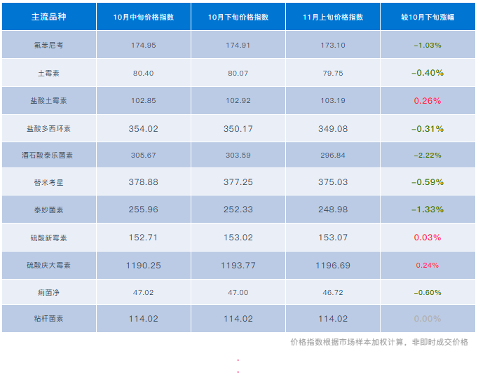 泰乐菌素、替米考星、泰万菌素--大单解锁,主流厂家重新对外发货,需求支撑乏力,冲高回落,(市场酒泰300元/kg附近、磷替330元/kg附近、替米考星375元/kg附近、泰万菌素415元/kg附近、泰妙菌素250元/kg附近),本期市场价格指数弱稳运行。