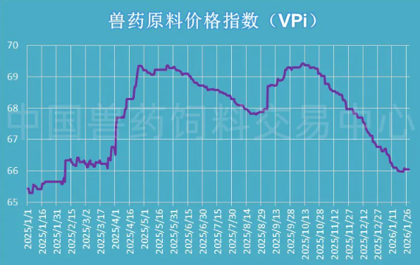 28日兽药原料药价格指数(VPi)收于66.05,微涨0.11%,VPi走势表现出明显的止跌迹象,市场情绪有所修复。