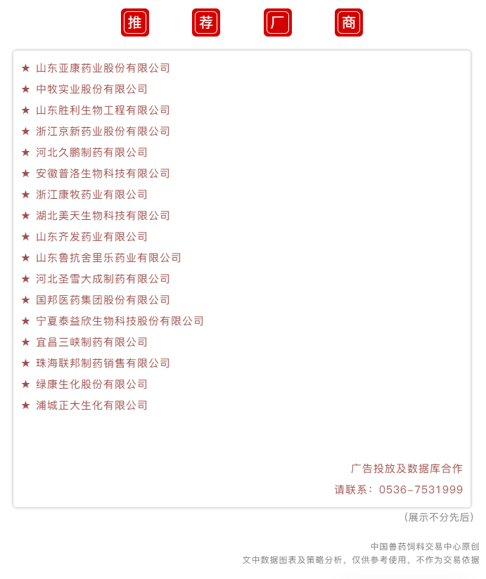 3、兽药原料:兽药原料药市场稳中有跌,走势分化,在供应端持续消息释放下,整体供应有趋紧迹象。特别是乙酰甲喹、土霉素和盐酸多西环素,出厂价格成交区间均有上行态势;酒石酸泰乐菌素及其相关品类替米考星厂家维持宽松预期,价格高位回落持续;注意,氟苯尼考价格低位反弹。市场交易将会随着春节临近而逐渐趋于冻结。