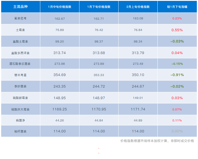 氟苯尼考--市场流传主流大厂停报,底部小幅反弹(成交158-170元/kg),本期市场价格指数底部震荡运行。