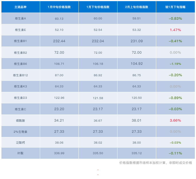 市场整体保持平稳,维持刚需,谨慎多观望。烟酰胺、VE等市场多有停报、停产消息流出,供应紧张,价格持续走强;VB6、VA、VD3等需求弱势,价格有所走弱。随着春节临近,预计市场不会出现大面积的变动,将整体维稳运行至春节期间,小部分品类现货紧张状态可能对春节前后走势产生较大影响,价格或有上行空间。