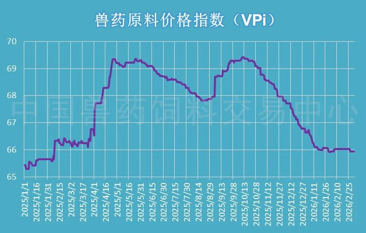 据中国兽药饲料交易中心监测,3月4日,兽药原料药价格指数(VPi)收于65.95点,较节前微跌0.12%,整体呈现“涨跌互现、稳中偏弱”的运行特征。